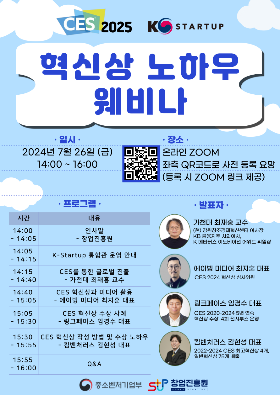 이번 CES 2025 K-Startup 온라인 세미나는 CES에 관심 있는 사람이면 누구나 참여 가능하며, 세미나 포스터의 QR코드를 통해 신청할 수 있다. 신청자에게는 행사 전일에 세미나 접속 URL이 발송된다.