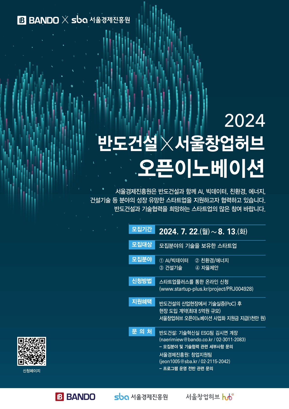서울경제진흥원(SBA)은 반도건설과 협력하여 7월 22일부터 ‘2024 반도건설 X 서울창업허브 오픈이노베이션’ 프로그램을 진행한다고 밝혔다.