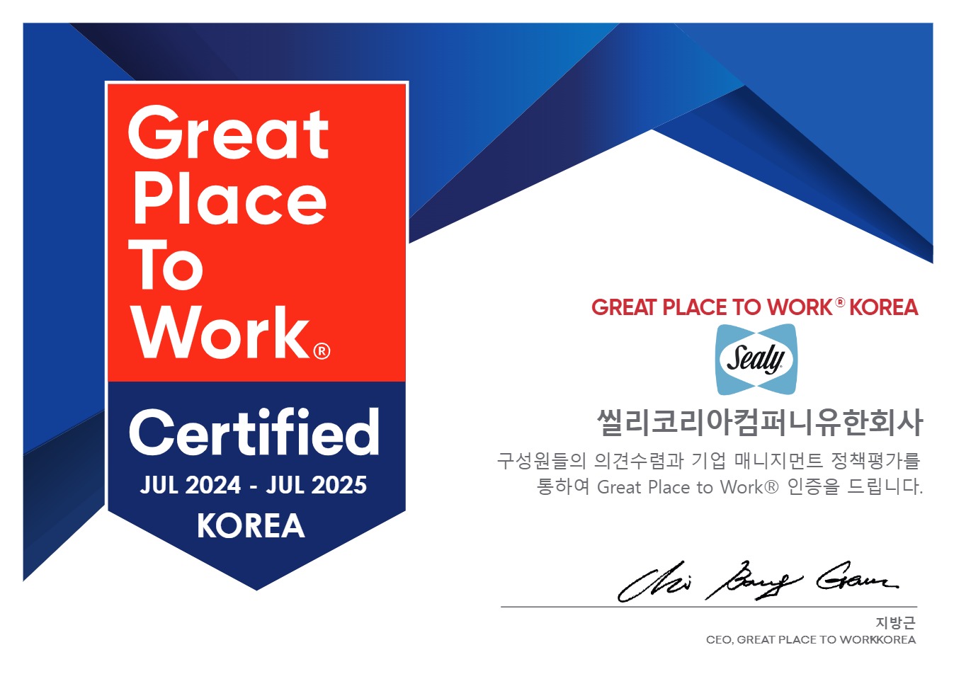 씰리코리아 윤종효 대표는 “GPTW ‘일하기 좋은 기업’으로 선정된 것도 영광이지만 선정 과정에서 직원들이 회사와 함께 성장해 나가는 것에 자부심과 보람을 느끼고 있다는 사실을 알게 돼 더욱 뜻깊은 것 같다”며 “앞으로도 긍정적인 사내 문화를 조성하고 최상의 근무 환경을 제공하기 위해 노력하겠다”고 전했다.