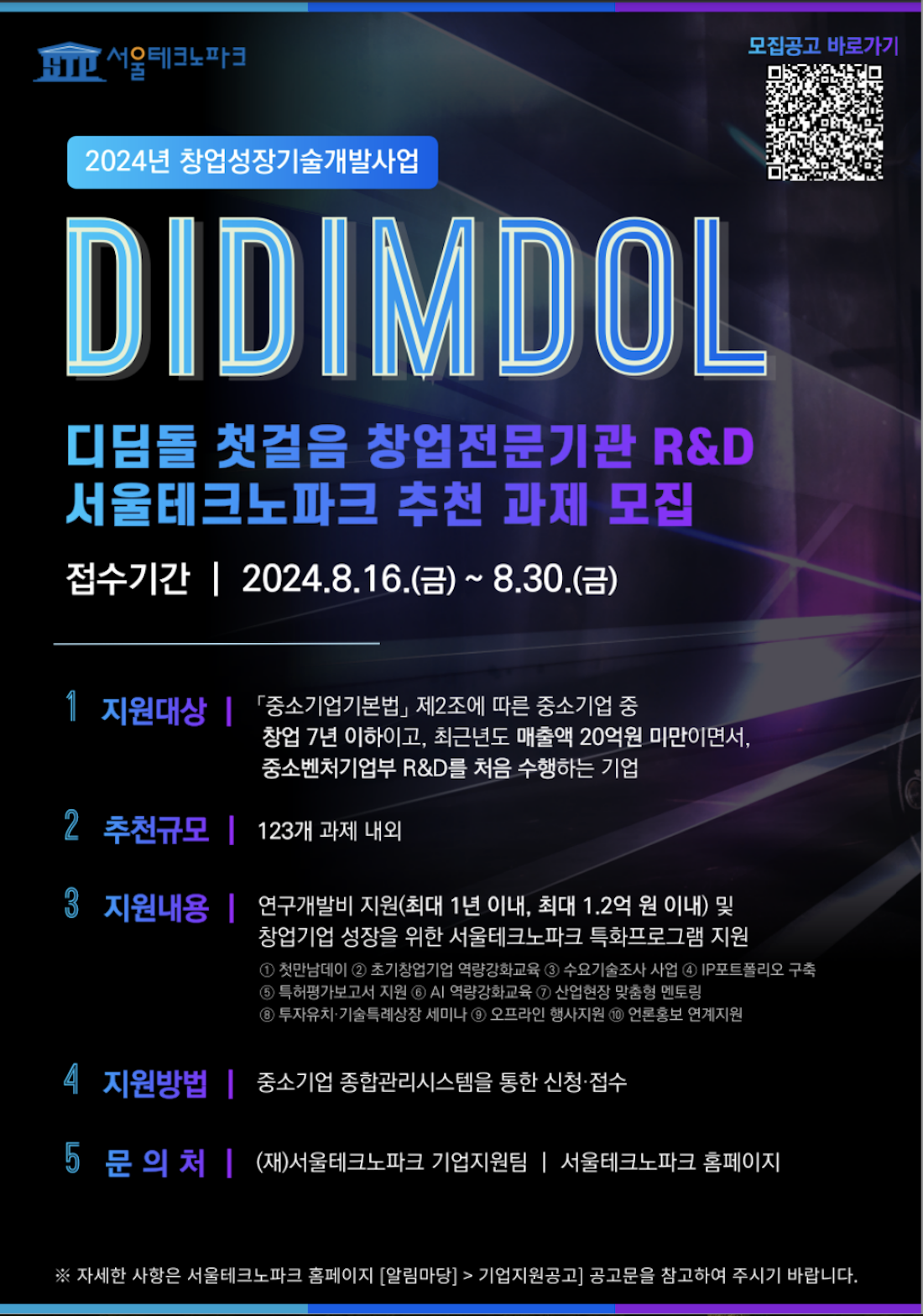 (재)서울테크노파크가 2024년 창업성장기술개발사업 디딤돌 첫걸음 운영기관으로 선정되어 오는 8월 16일부터 30일까지 창업전문기관 R&D 과제를 모집한다.