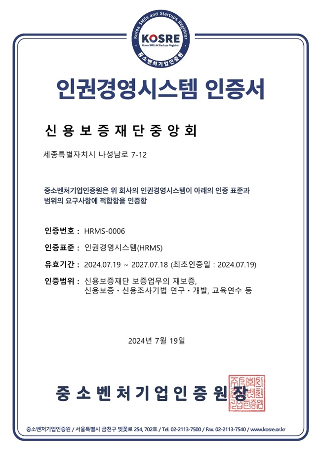 중소벤처기업인증원(원장 엄진엽, KOSRE)신용보증재단중앙회가(회장 이상훈, 이하 신보중앙회)가 인권경영시스템 인증을 획득했다고 밝혔다.
