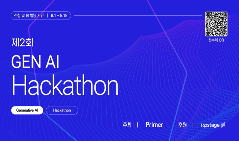 스타트업 액셀러레이터 프라이머(대표이사 권도균)는 인공지능(AI) 창업을 촉진하고 AI 인재들의 팀 빌딩을 목표로 한 ‘제2회 GenAI 해커톤’을 개최한다고 밝혔다.