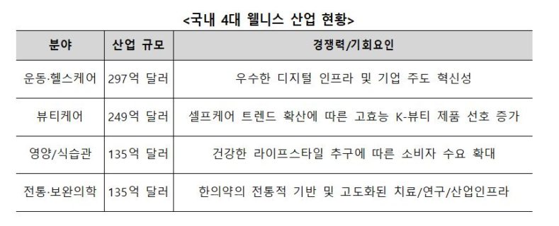 팬데믹 이후 건강관리에 대한 관심 증대, 고령화로 인한 만성질환 확대, 전통적 건강관리 재조명 등을 배경으로 급성장하고 있는 세계 웰니스 시장을 공략하기 위해서는 우리나라가 경쟁력을 보유한 운동‧헬스케어, 전통‧보완의학 등 주요 웰니스 산업을 수출산업으로 육성해야 한다는 주장이 나왔다.