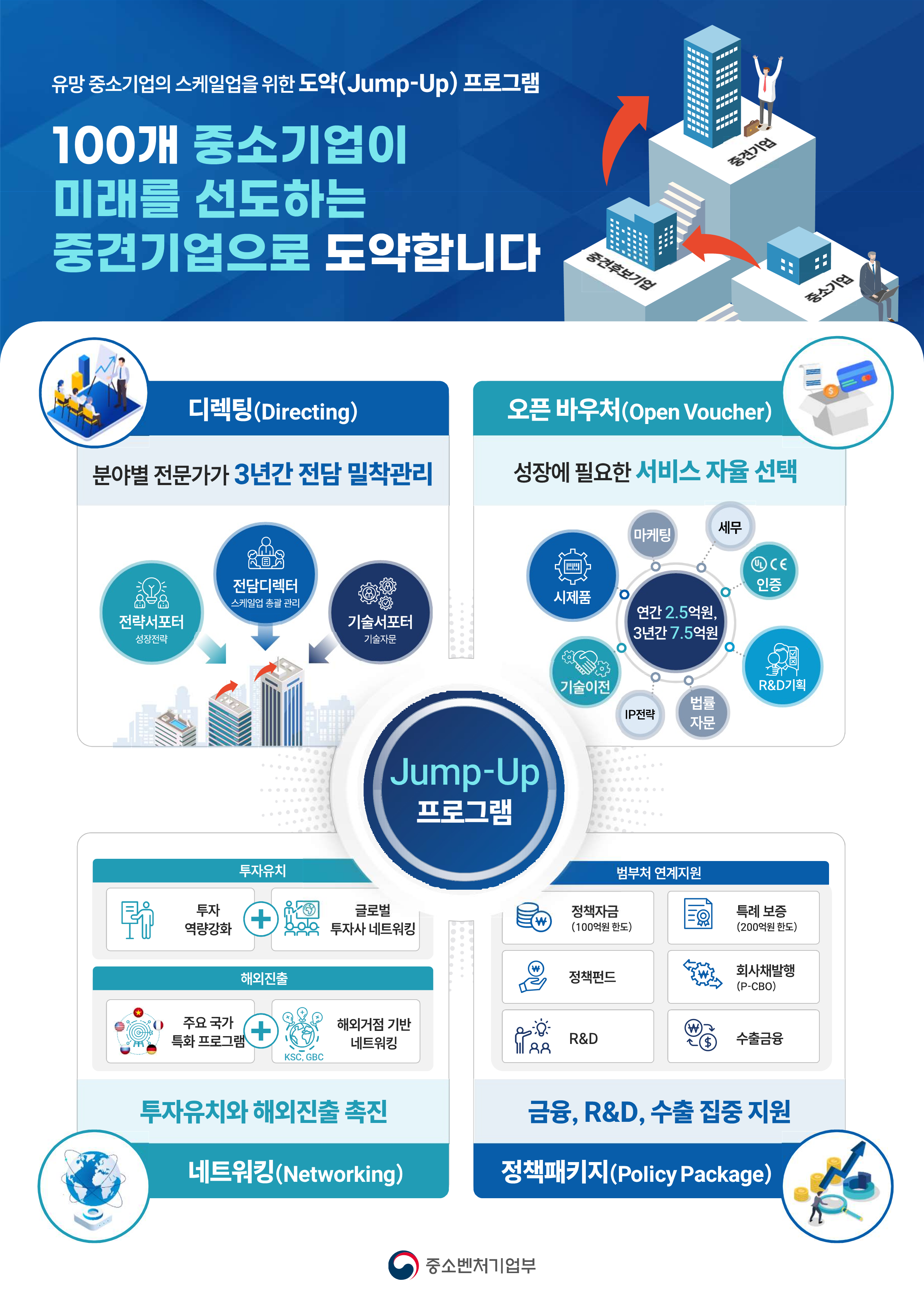 중소벤처기업부(장관 오영주, 이하 중기부)는 기업의 성장사다리를 복원하고 우리 경제 전반에 역동성을 불어넣기 위해 8월 7일 경제관계장관회의에서 「도약(Jump-Up) 프로그램 추진방안」을 확정해 발표했다.