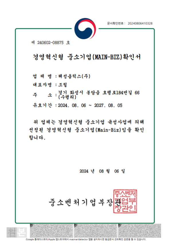 해성옵틱스는 중소벤처기업부가 인증하는 경영혁신형 중소기업 ‘메인비즈(MAIN-BIZ)’ 인증을 획득했다고 8일 밝혔다.