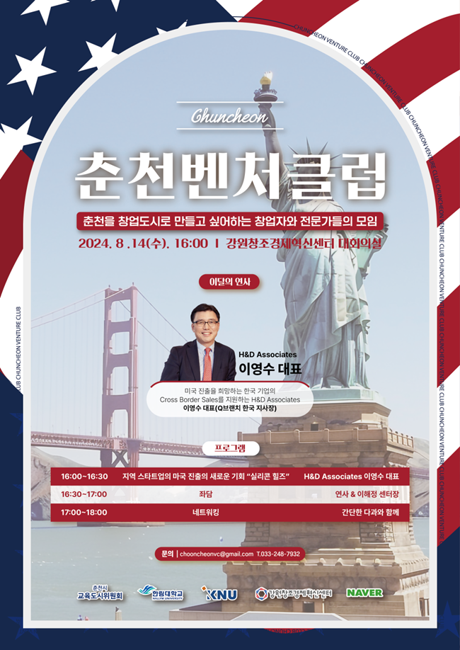 이해정 센터장은 “이번 행사에서 현지 경험이 풍부한 이영수 대표의 발표와 좌담을 통해 창업자들에게 글로벌 인사이트를 제공할 수 있을 것으로 기대한다”라며 “강원혁신센터는 지역 창업 생태계 활성화뿐만 아니라 창업기업의 글로벌 진출을 위해서도 노력할 예정이니 미국진출에 관심 있는 창업자들의 많은 참여를 바란다”라고 말했다.