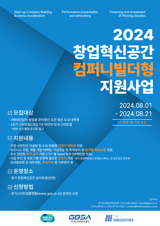 경기도경제과학진흥원이 주최하고 초기 투자 액셀러레이터 더이노베이터스가 주관하는 이번 지원 사업은 경기도 내 예비 및 초기 창업자를 발굴해 밀착 지원해 도내 유망 스타트업 육성을 목표로 한다.