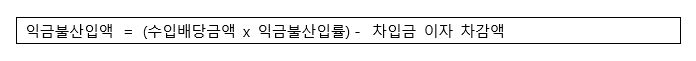 수입배당금 익금불산입액은 아래의 계산식에 따른 금액을 익금에 산입하지 않도록 하고 있다.