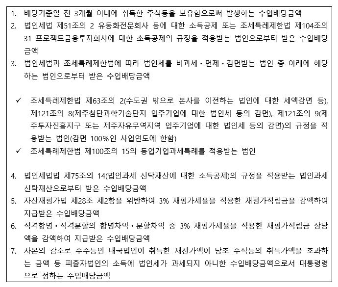 수입배당금액은 피출자법인으로부터 받은 이익의 배당액이나 잉여금의 분배액 및 법인세법에 따른 의제배당액을 포함한다. 다만, 법에 정한 다음의 수입배당금액의 경우, 익금불산입 대상 수입배당금액에서 제외된다. 아래에 해당하는 경우 모두 이중과세 문제가 발생하지 않아 본 규정이 적용될 여지가 없기 때문이다.