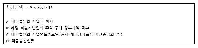 출자법인이 차입금을 보유하는 경우에는 아래의 산식에 의한 금액을 익금불산입 계산시 차감하여야 한다.