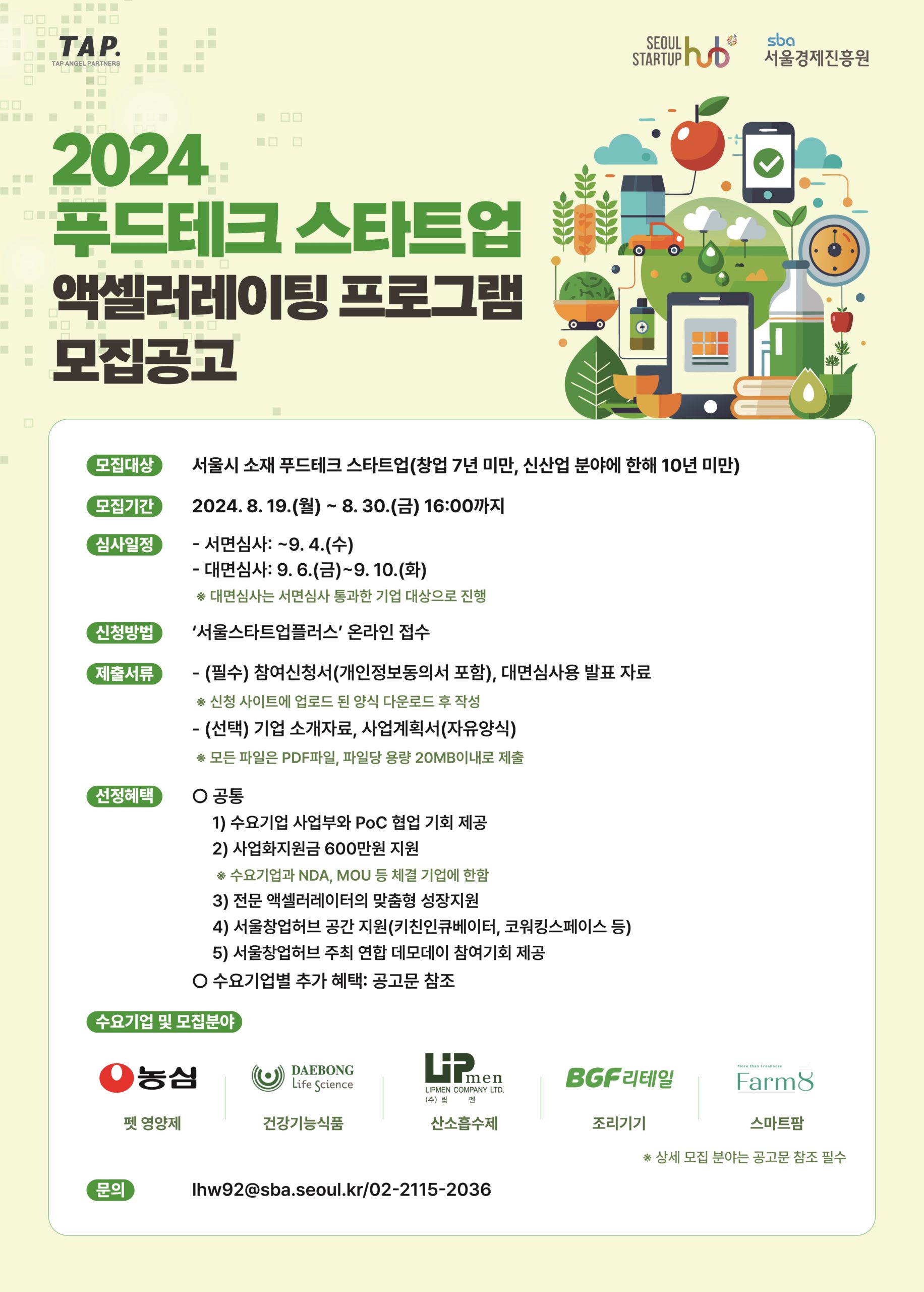 서울경제진흥원(SBA)이 운영하는 서울창업허브는 혁신적인 기술과 아이디어를 가진 푸드테크 스타트업을 발굴 및 지원하고자 ‘2024 푸드테크 스타트업 액셀러레이팅 프로그램’ 참여기업을 모집한다고 밝혔다.