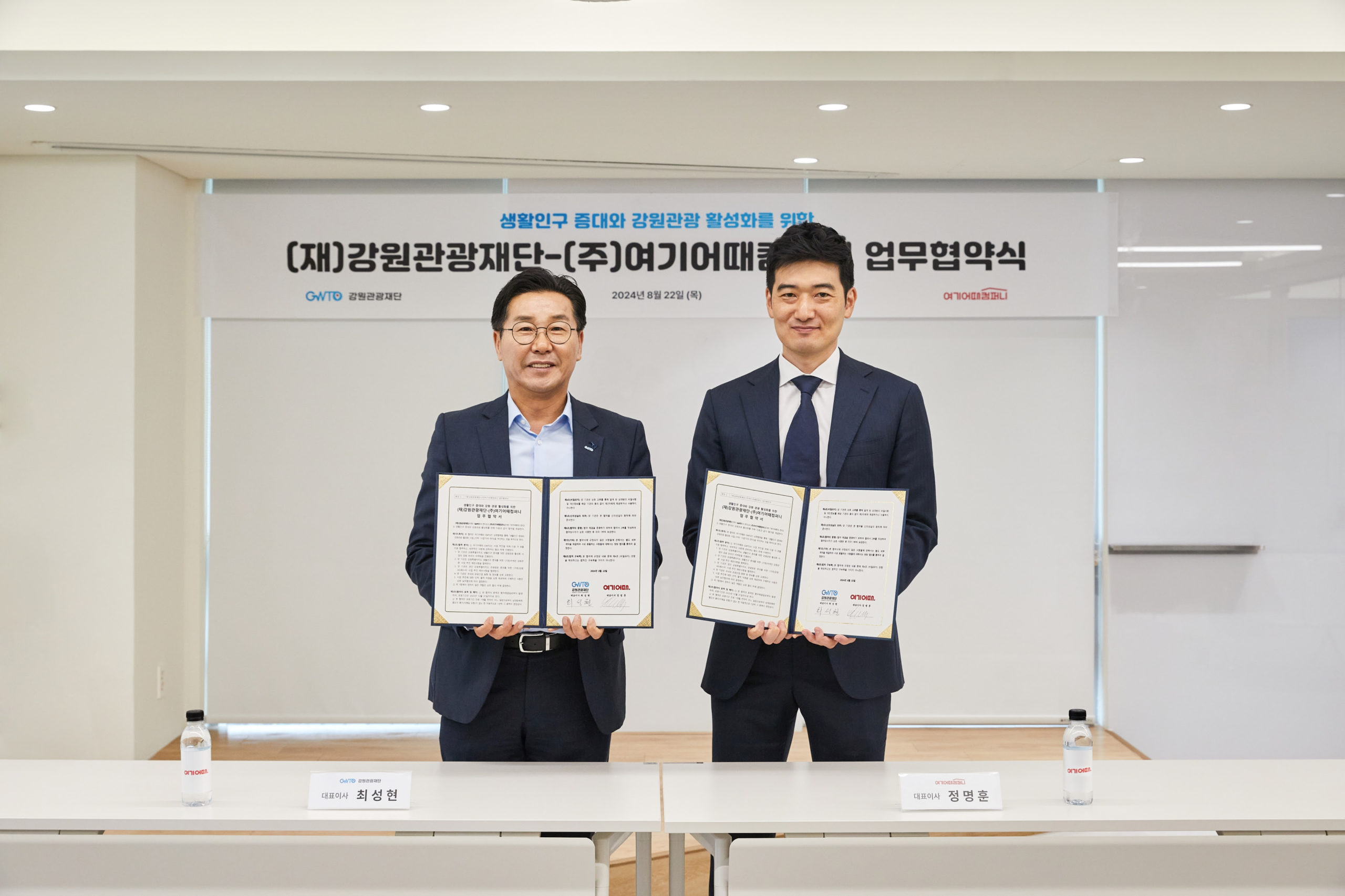 여기어때는 지난 22일 강원관광재단과 양해각서(MOU)를 체결했다고 밝혔다. 이번 MOU는 (주)여기어때컴퍼니 정명훈 대표이사와 (재)강원관광재단의 최성현 대표이사 등의 관계자가 참석한 가운데 여기어때컴퍼니 본사에서 진행됐다.