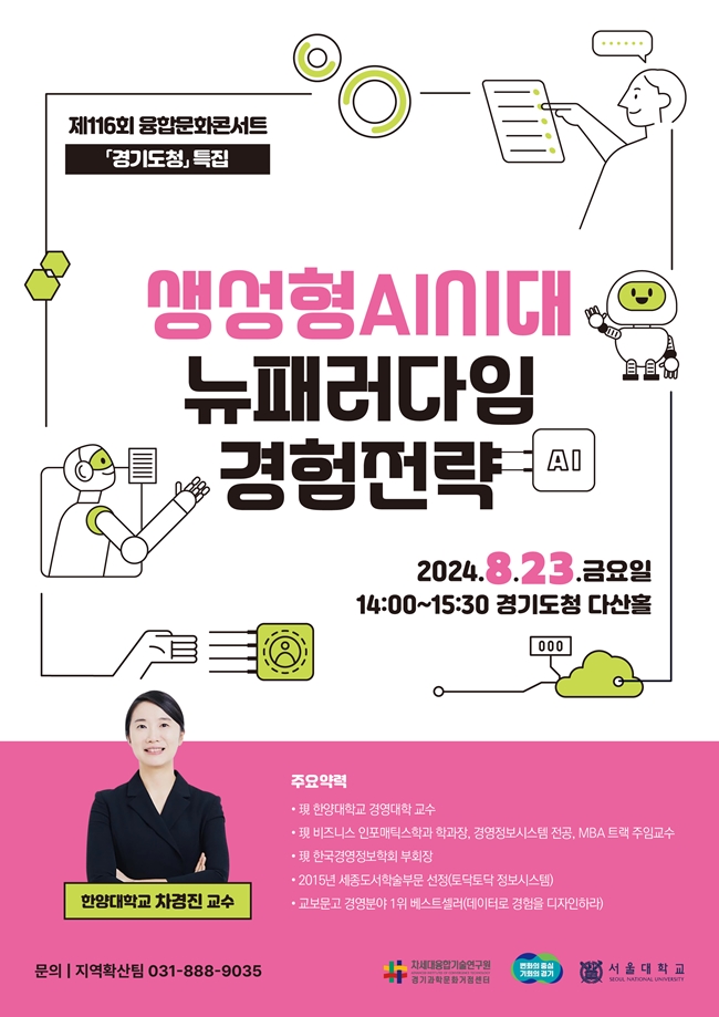 ‘생성형 AI 시대 뉴패러다임 경험전략’을 주제로 열리는 이번 강연은 과학기술정보통신부가 주최하고, 경기도가 주관하는 ‘2024년 지역과학문화 역량 강화 사업’의 일환이다.