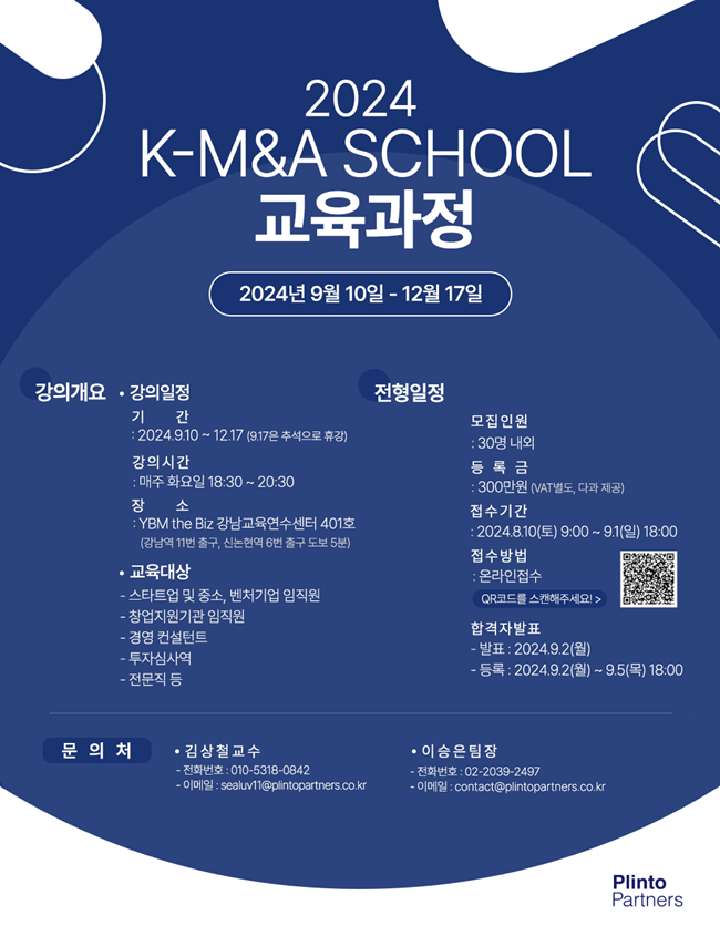 교육과 초기투자 전문 액셀러레이터인 ㈜플린토파트너스(대표 권지예)는 스타트업, 중소⋅벤처기업의 M&A 활성화를 위해 ‘K-M&A School’ 1기 수강생을 9월 1일까지 모집한다. 개강일은 9월 10일이다.