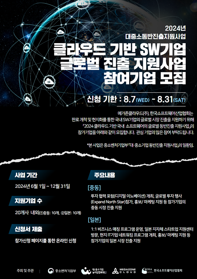 본 사업은 중소벤처기업부 ‘대·중소기업 동반진출 지원사업’ 일환으로 KOSA와 메가존클라우드가 주관하고, 사업 신청은 KOSA 공지사항(sw.or.kr)을 통해 확인할 수 있다.