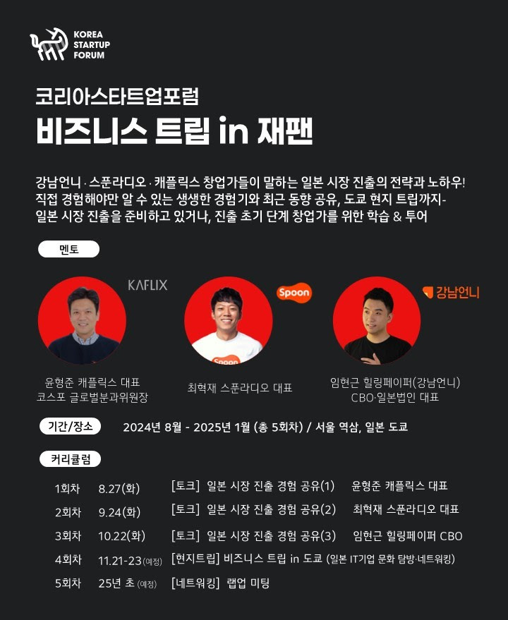 프로그램은 총 5회에 걸쳐 진행된다. 먼저 발빠르게 일본 시장에 진출해 자신들만의 비즈니스를 성공적으로 구축한 스타트업의 강연이 세 차례에 걸쳐 열린다. 27일 글로벌분과위원장을 맡고 있는 윤형준 캐플릭스 대표를 시작으로 9월 최혁재 스푼라디오 대표, 10월 임현근 힐링페이퍼(강남언니) CBO 겸 일본 법인 대표가 연사로 나서 일본에 사업을 진출하면서 겪었던 생생한 경험담과 함께 현지화 전략을 공유한다.