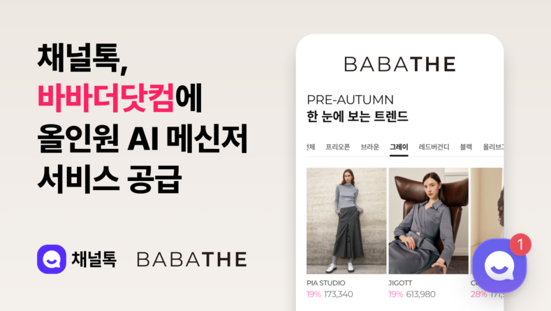(주)채널코퍼레이션(대표 최시원)은 바바더닷컴(회장 문인식)과 올인원 AI 비즈니스 메신저 ‘채널톡’ 공급 계약을 맺고, 프리미엄 쇼핑 플랫폼 ‘바바더닷컴’을 위한 맞춤형 상담 지원에 나선다고 밝혔다.
