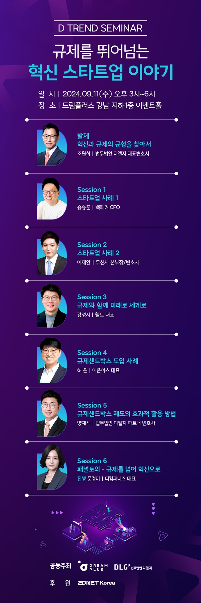법무법인 디엘지(구 법무법인 디라이트∙대표변호사 조원희)와 드림플러스(센터장 길세운)가 오는 9월 11일 오후 3시 드림플러스 강남 지하 1층 이벤트홀에서 ‘규제를 뛰어넘은 혁신 스타트업’ 세미나를 공동 개최한다고 밝혔다.