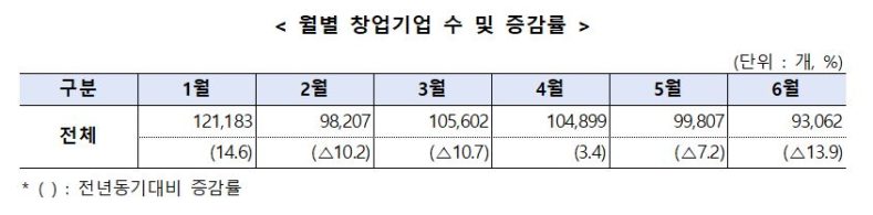 1~6월간 월별 창업은 1월과 4월을 제외하고는 감소한 모습을 보였다.