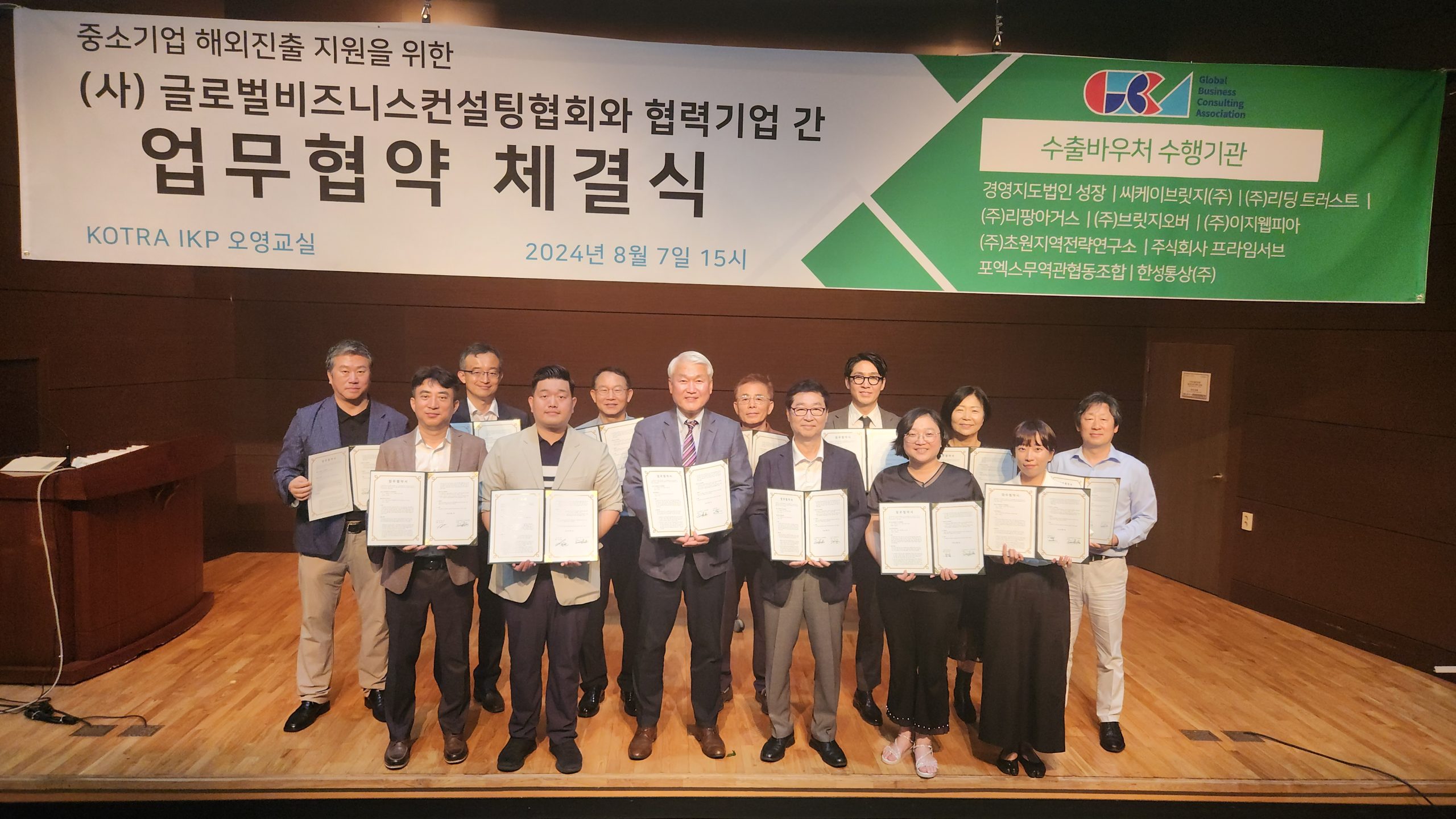 사단법인 글로벌비즈니스컨설팅협회(이하, GBCA)는 지난 8월 7일, KOTRA IKP 3층 오영교실에서 GBCA 회원사 가운데, 수출바우처사업 수행기관으로 활약하고 있는 기업들과 업무협약을 체결했다.