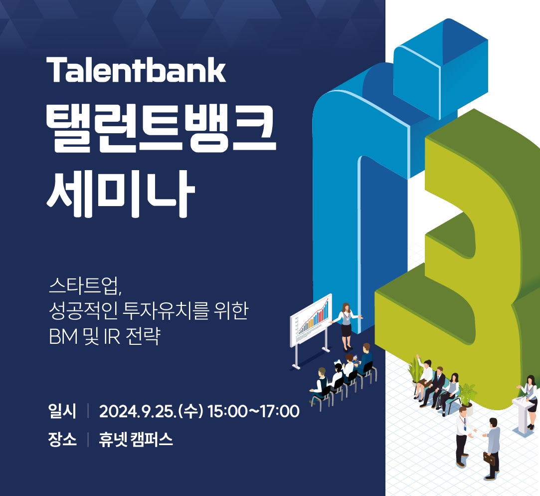 탤런트뱅크는 오는 25일 서울 구로구 휴넷캠퍼스에서 ‘스타트업, 성공적인 투자유치를 위한 BM 및 IR 전략’을 주제로 전문가 세미나를 개최한다고 밝혔다.