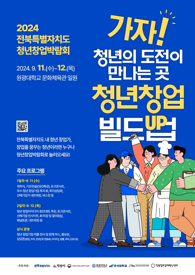 전북자치도와 전북창조경제혁신센터(센터장 강영재)는 오는 9월 11일부터 12일까지 이틀간 원광대학교 문화체육관 일원에서 ‘2024년 전북특별자치도 청년창업박람회’를 개최한다고 밝혔다.