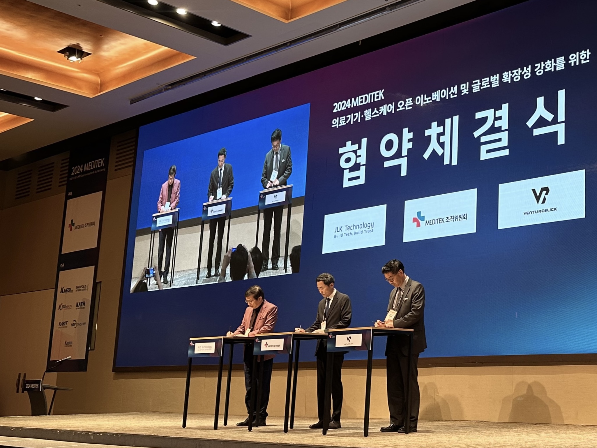 행사 첫날인 4일, 벤처블릭은 협력사인 글로벌 CDMO 기업 JLK Technology와 메디테크 조직위원화와 함께 메디테크의 글로벌화를 촉진하고 메디테크 참여 기업, 대학, 연구소 등의 본격적인 해외 진출 지원을 목적으로 하는 3자 업무 협약(MOU)를 체결했다. 주요 협약 내용은 ▲각 기관 보유 역량 및 네트워크를 활용한 상호협력체계 구축 ▲메디테크 유관기관의 글로벌 생산 관련 지원 ▲메디테크 유관기관의 해외 진출을 위한 맞춤형 솔루션 제공이다.