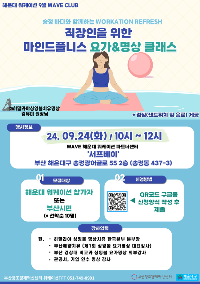 ‘송정 바다와 함께하는 워케이션 리프레시’라는 주제로 열리는 이번 행사의 핵심은 ‘직장인을 위한 마인드풀니스 요가 및 명상 클래스’이다. ㈜히말라야싱잉볼치유명상의 김유미 원장이 강사로 나서 참가자들에게 싱잉볼과 함께하는 요가와 명상의 세계로 안내할 예정이다.