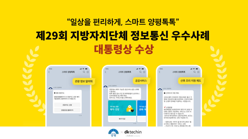 카카오 IT 솔루션 개발 자회사 디케이테크인(대표 이원주)과 양평군(군수 전진선)이 공동 기획·개발한 ‘스마트 양평톡톡’이 제29회 지방자치단체 정보통신 우수사례 발표대회에서 ‘대통령상’을 수상했다고 12일 밝혔다.