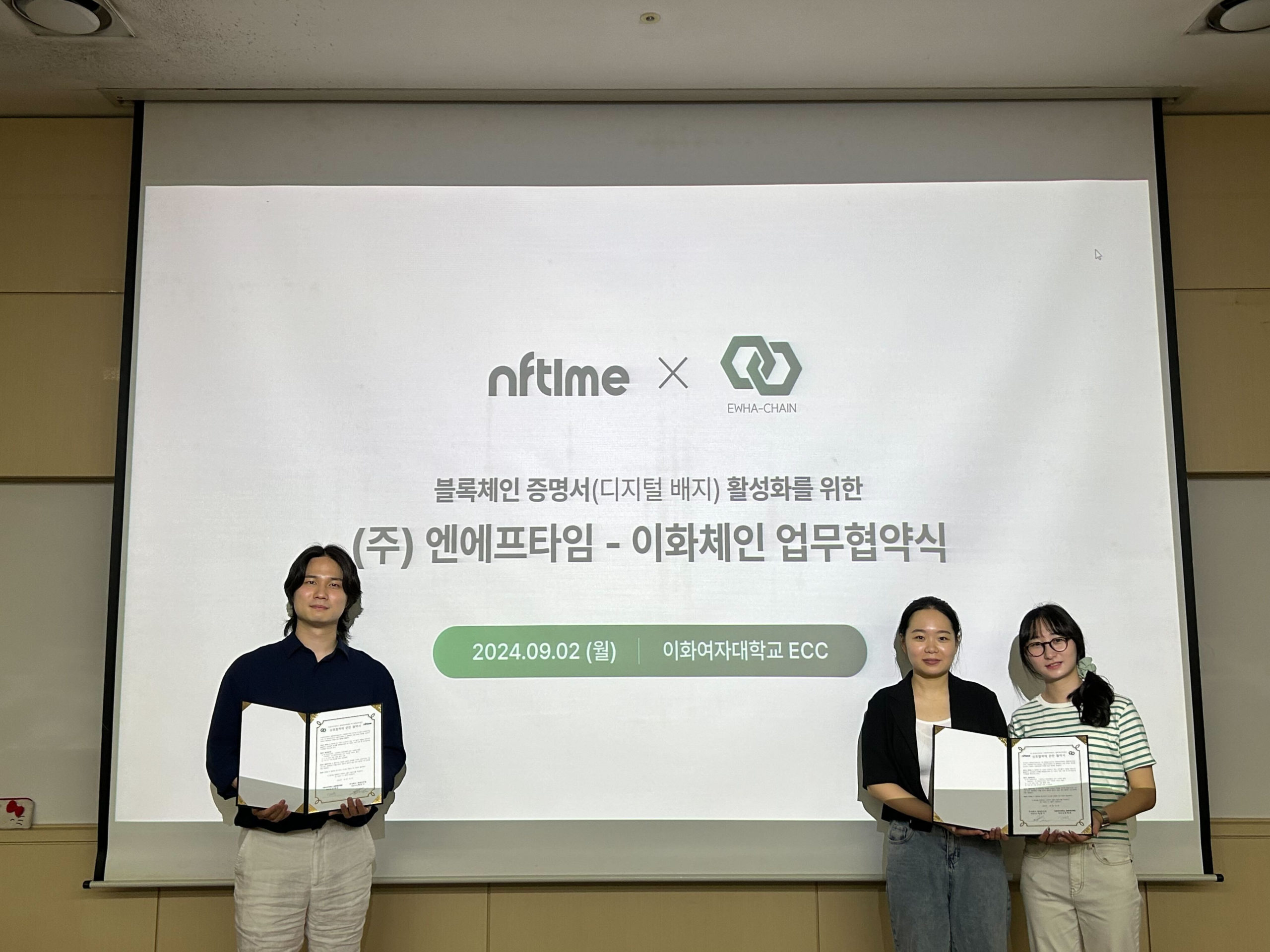 엔에프타임이 지난 2일 이화여자대학교 블록체인 학회 이화체인(이하 ‘이화체인’)과 ‘블록체인 증명서(디지털 배지) 활성화를 위한 업무협약(MOU)’을 체결했다고 밝혔다.