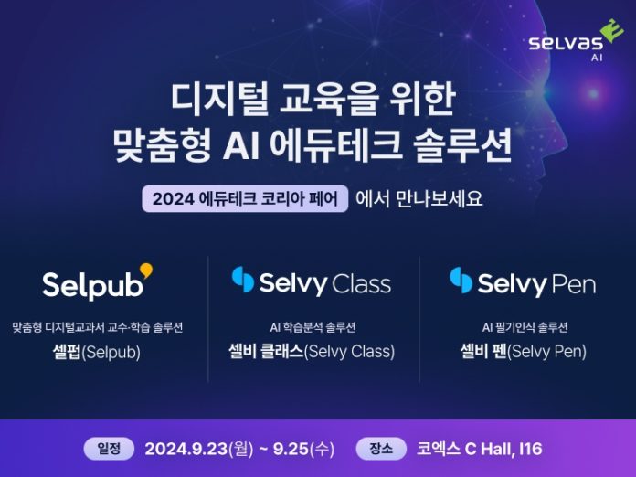 인공지능 전문기업 셀바스AI(대표이사 곽민철)가 오는 23일부터 25일까지 3일간 서울 코엑스에서 열리는 ‘2024 에듀테크 코리아 페어’에 참가해 디지털 교육을 위한 맞춤형 AI 에듀테크 솔루션을 선보인다.