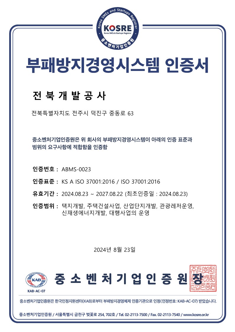 중소벤처기업인증원(KOSRE)은 전북개발공사가 ISO 37001(부패방지경영시스템) 인증을 취득했다고 밝혔다.