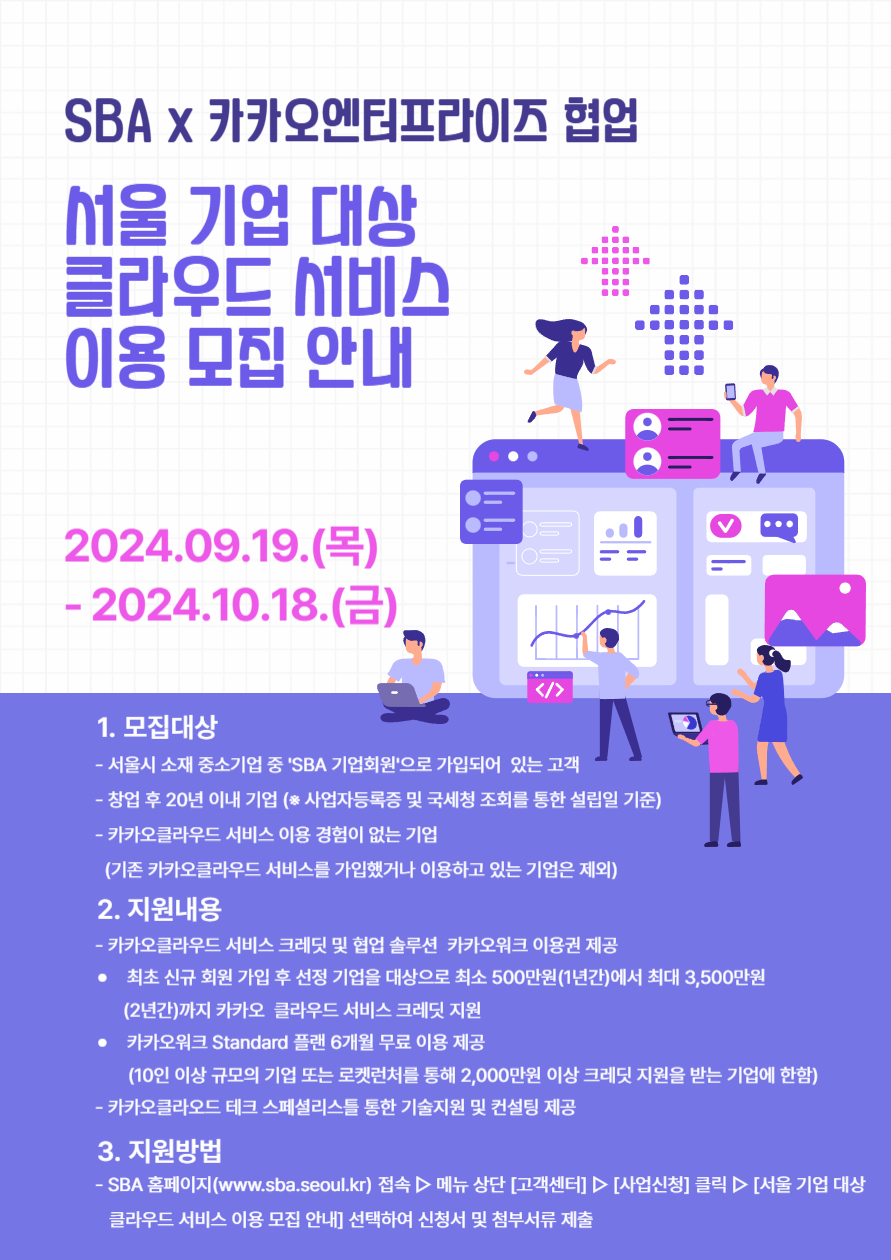 서류 심사를 거쳐 최종 선정된 기업에게는 최대 3,500만원(2년)간 클라우드를 이용할 수 있는 카카오클라우드 서비스 크레딧 및 협업 솔루션(6개월) 이용권을 제공한다.