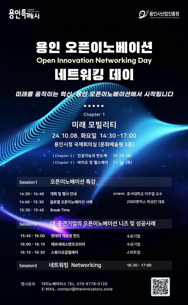 용인특례시와 용인시산업진흥원이 주최하고 더이노베이터스가 주관하는 ‘용인 오픈이노베이션 네트워킹 데이’가 오는 10월 8일 용인시청 문화예술관 국제회의실에서 열린다. 이번 행사는 첨단산업 혁신 생태계를 구축하고, 기업 간 협력을 통해 혁신적 비즈니스 모델을 창출하는 것을 목표로 한다.