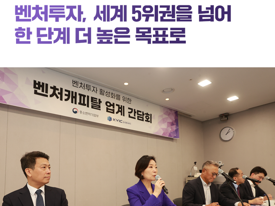 중소벤처기업부(이하 중기부) 오영주 장관은 지난 9월 30일 서울 종로구 광화문빌딩에서 벤처캐피탈 업계 간담회를 개최하여 벤처투자 정책 방향에 대해 논의하는 시간을 가졌다. 이날 간담회는 지난 5월 발표한 중소기업 정책 청사진인 ‘중소기업 도약전략’ 후속으로 벤처 투자 분야 세부대책을 수립하기에 앞서, 벤처투자 업계 및 학계와 함께 국내 벤처투자 생태계가 글로벌 수준으로 도약하기 위한 선결 과제를 논의하기 위해 마련되었다 본격적인 자유토론에 앞서 한국개발연구원(KDI) 구자현 선임연구위원은 수행 중인 연구의 중간결과로 ‘벤처투자의 경제적 효과 및 벤처투자 시장에서의 모태펀드 역할’을 발제하였다. 이번 연구를 통해 벤처투자 유치가 스타트업의 총자산 대비 매출액(연 +13%) 및 영업이익(연 +5%) 추가 증가 등 성장으로 이어진다는 통념을 국내 벤처투자 시장 데이터로 한번 더 입증하였다. 아울러 모태펀드의 민간 자금 유입효과도 여전히 상당한 것으로 나타났다. 최근 10년간(’14~’23) 모태펀드 출자 증가 시 전체 벤처투자 규모는 5.2배 증가하였다. 모태펀드 자펀드에 한정하면, 모태펀드 출자금 대비 자펀드 투자규모는 과거 10년간(’04~’13) 1.3배에서 최근 10년간(’14~’23) 1.7배로 오히려 증가한 것으로 나타났다. 오영주 장관은 “우리나라 벤처투자 규모는 미국, 중국, 영국, 인도에 이어 전세계 5위 수준을 기록하고 있으며, ’87년 벤처투자조합 제도화 이후 청산된 펀드는 연평균 9%의 높은 수익률을 거둔 것으로 나타났다”면서 “한국이 벤처투자 선진국으로 성장하고, 높은 수익률을 거둬온 성과는 도전을 주저하지 않은 우리 스타트업의 노력과 이를 믿고 지지해준 벤처투자자의 역할이 매우 컸다고 생각한다”고 밝혔다. 또한 “이제는 세계 5위권을 넘어 한 단계 더 높은 목표를 향해야 하는 시점”이라면서 “우리 스타트업이 충분한 벤처투자를 유치하여 글로벌 기업을 상대로 경쟁우위를 선점할 수 있는 글로벌 벤처투자 생태계 조성방안을 조만간 발표할 계획”이라고 덧붙였다. 관련 기사 더 보기 https://www.venturesquare.net/941426