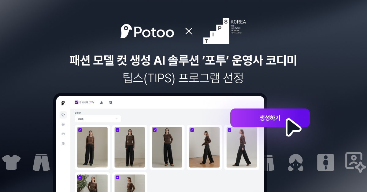 코디미가 중소벤처기업부가 주관하는 기술 창업 지원 프로그램 ‘팁스(TIPS)’에 선정됐다. 코디미는 패션 이커머스에서 클릭 한 번으로 고퀄리티 모델 이미지를 생성할 수 있는 SaaS 솔루션 ‘포투(Potoo)’를 운영하고 있다.