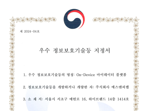 마이데이터 전문 기업인 에스앤피랩(SNPLab)의 On-Device 마이데이터 플랫폼 기술이 ‘2024년 우수 정보보호 기술·제품’으로 지정됐다. 우수 정보보호 기술·제품 지정제도는 과학기술정보통신부와 한국인터넷진흥원(KISA)이 주관하며, 정보보호 분야 유망 신기술·제품·서비스를 보유한 7년 이하의 벤처기업을 대상으로 민간차원의 신기술 R&D 투자 활성화 및 판로개척 등 성장 지원을 목적으로 한다. 이번에 지정된 ‘On-Device 마이데이터 플랫폼 기술’은 에스앤피랩에서 서비스하고 있는 마이디(my:D)에 적용된 것으로 물리적 서버 없이 개인 스마트폰 단말기에 데이터를 분산 저장하는 기술로써 국내 기술의 차별성, 발전 가능성, 사업화 가능성에 대한 평가항목에서 인정을 받았다. 에스앤피랩 관계자는 “이번에 지정된 것은 On-Device 기반 마이데이터 산업의 선두주자로서 입지를 확고히 할 수 있는 기반이 될 수 있다” 며 “모든 개인이 주권을 가지고 안전하게 개인 데이터를 활용할 수 있는 날이 앞당겨질 수 있도록 노력하겠다”고 강조했다. 한편 이번에 선정된 기업에게는 과학기술정보통신부 장관 명의 지정서, 지정마크 등의 혜택이 주어지며, 정부 부처 및 지자체 등 우수 정보보호 기술 등의 수요 연계형 판로가 지원된다. 관련 기사 더 보기 https://www.venturesquare.net/936165