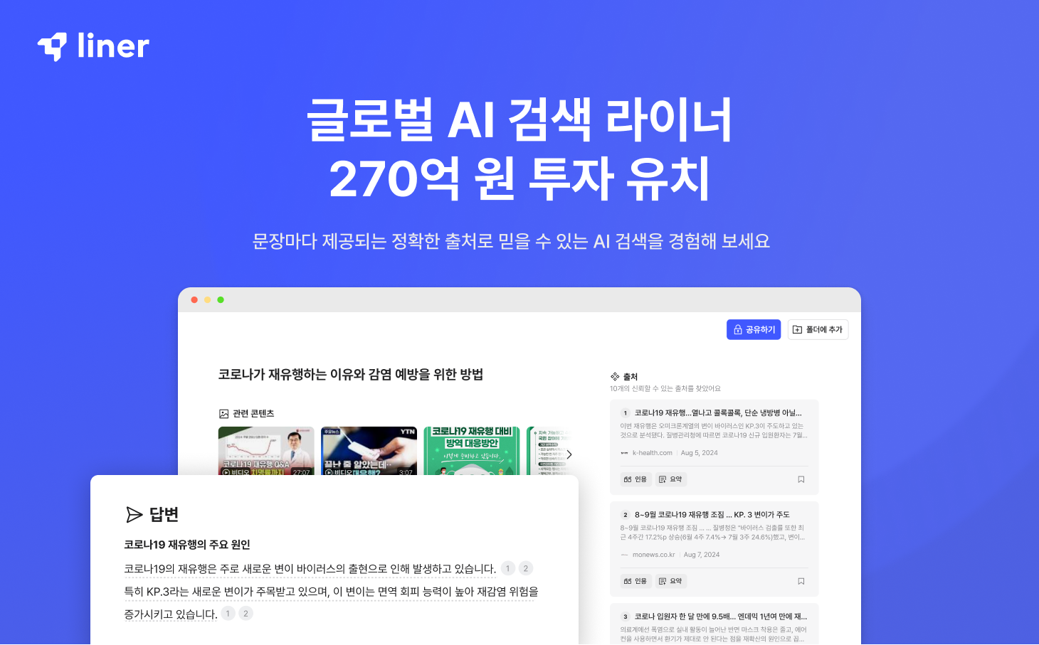글로벌 AI 검색 스타트업 라이너(Liner)가 270억 원 규모의 시리즈 B2 투자를 유치했다고 밝혔다. 이번 투자로 라이너는 총 누적 투자금 440억 원을 기록했다. 이번 시리즈 B2 투자 라운드는 에이티넘인베스트먼트와 인터베스트가 주도했으며, 삼성벤처투자와 LB인베스트먼트도 참여했다. 기존 투자자인 캡스톤파트너스, IBK기업은행, SL인베스트먼트도 후속 투자를 이어갔다. 라이너는 2022년 시리즈 B1에서 110억 원을 유치한 바 있으며, 이번 B2 투자로 시리즈 B 라운드에서만 총 380억 원을 확보했다. 라이너는 AI 검색 서비스의 기술적 역량을 인정받아 이번 대규모 투자 유치에 성공했다. 2015년 하이라이팅 서비스를 시작한 라이너는 사용자가 중요하다고 직접 선택한 데이터를 기반으로, 관련성과 품질이 높은 정보를 제공하는 독창적인 기술력을 확보했다. 특히 2023년에는 자체 개발한 대형 언어 모델(LLM)을 통해 신뢰할 수 있는 AI 검색 서비스를 출시했다. 김진우 라이너 대표는 “이번 투자 유치를 통해 라이너의 기술력과 경쟁력을 인정받았다”며, “앞으로도 서비스 고도화에 집중하고, 인재 채용과 마케팅에도 적극 투자해 글로벌 AI 검색 시장에서 독보적인 위치를 확립할 것”이라고 밝혔다. 관련 기사 더보기 https://www.venturesquare.net/894017