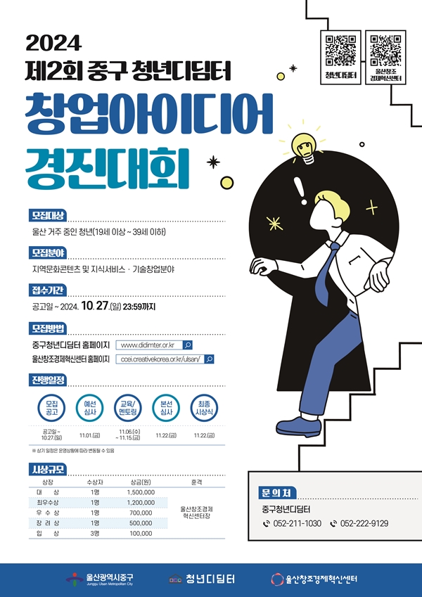 청년디딤터 관계자는 “이번 창업아이디어 경진대회는 단순한 아이디어 경쟁을 넘어, 청년들이 자신의 비전을 구체화하고 실제 창업으로 이어질 수 있도록 체계적인 지원을 제공하는 자리이다. 특히, 중구 청년 창업자들이 지역 경제에 활력을 불어넣고, 혁신적인 비즈니스 모델로 새로운 기회를 창출할 수 있기를 기대한다”며 “청년들의 아이디어가 울산의 미래를 밝히는 디딤돌이 될 것”이라고 밝혔다.