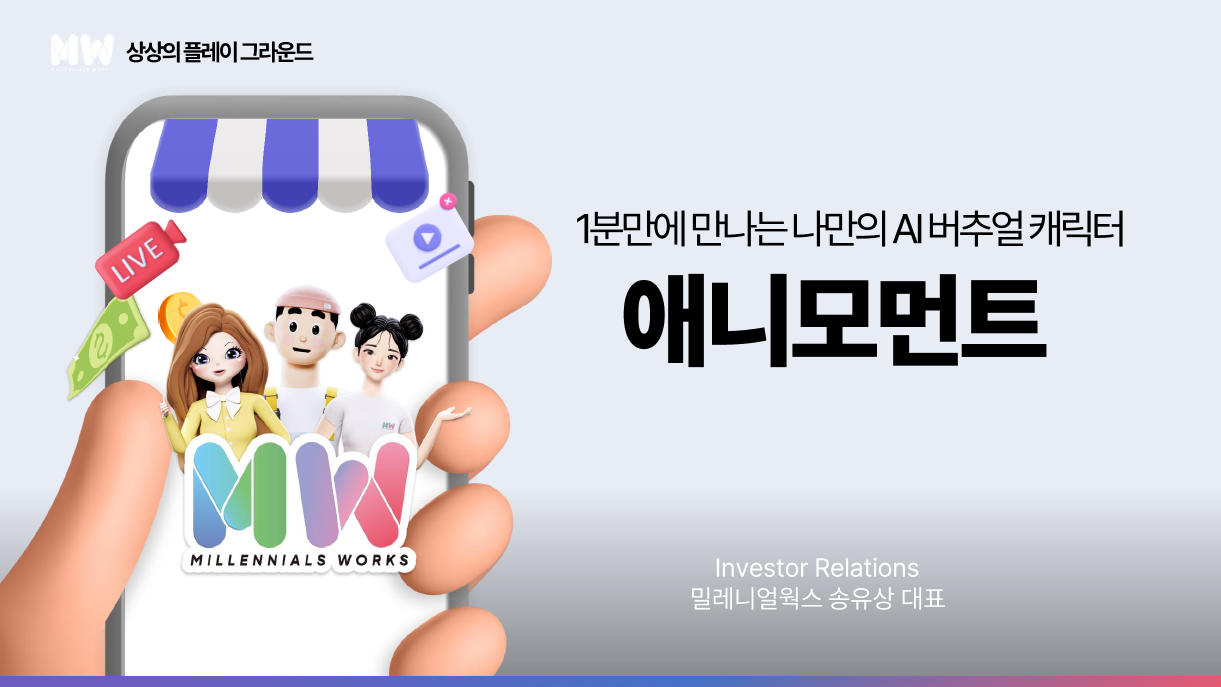 밀레니얼웍스는 애니모먼트 서비스를 통해 버튜버들의 팬덤 비즈니스, 챌린지 문화, 나아가 굿즈 제작 까지 팬 뿐만 아니라 일반 대중들에게 체험형 콘텐츠 제공, 공간 기획을 통한 홍보 까지 아우르며 수익화했다. 현재, 1분 만에 나만의 버추얼 캐릭터를 제작 해주는 키오스크를 연말까지 현대, 롯데, AK플라자, DDP 등 20여 곳 배치하고 있으며 제작한 나만의 캐릭터로 말하고 움직이는 ‘TalKing Face’ 서비스로 확장 예정이고 일본, 대만, 베트남 등 글로벌 진출도 준비 중이다.