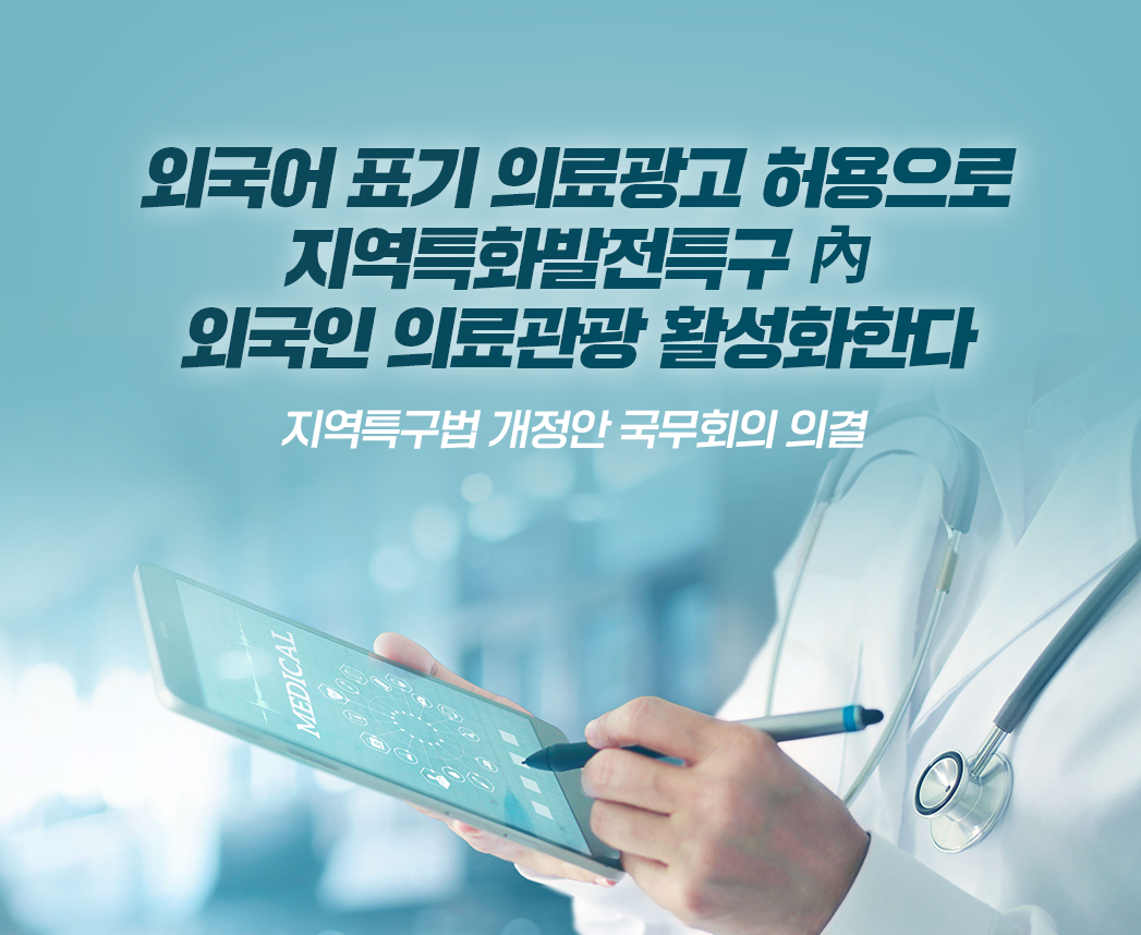 중소벤처기업부(장관 오영주, 이하 중기부)는 외국인 의료관광 관련 지역특화발전특구 내 외국어 표기 의료광고 허용 규제특례 신설을 위한 ‘규제자유특구 및 지역특화발전특구에 관한 규제특례법’(이하 지역특구법) 일부개정법률안이 22일(화) 국무회의에서 의결됐다고 밝혔다. ‘지역특화발전특구’는 지역균형발전 및 지역경제 활성화, 지역특화산업 육성 등을 위해 지역특성에 맞는 선택적 규제특례를 허용하는 구역이다. ’04년도 처음 도입된 지역특화발전특구는 그간 전국 기초자치단체 단위로 총 225개 특구를 지정하였으며, 현재는 143개 시군구에서 176개 특구가 운영 중이다. 현행 ‘의료법’ 제56조에 따라 의료인 등은 외국인 환자를 유치하기 위한 국내광고가 원칙적으로 금지되어 있으며, ‘의료해외진출법’ 특례로 공항·항만, 면세점 등 6개 구역에서만 외국어 표기 의료광고를 제한적으로 허용 중이다. 이번 개정안은 외국인 의료관광 증가와 관련 지역산업 육성을 위하여, 외국인 의료관광 관련 특화사업을 하는 자 중 대통령령으로 정하는 기준을 충족하는 경우 해당 지역특화발전특구에서 외국어 표기 의료광고를 할 수 있도록 특례를 신설하는 내용을 담고 있다. 현재 전국에서 운영 중인 의료관광 관련 지역특화발전특구는 총 4곳이며, ‘의료법(부대사업 범위 확대)’, ‘출입국관리법(외국인력 고용절차 간소화)’, ‘국토계획법(외국인 의료시설 건폐율․용적률 완화)’ 등 규제특례를 적용 중이다. 이에 더하여 특구 내 외국어 표기 의료광고가 가능해질 경우, 외국인 환자들의 의료기관에 대한 접근성과 이용 편의성이 보다 확대되어 관련 산업의 매출 및 고용 증가 등에 기여할 것으로 예상된다. 중기부 오영주 장관은 “정부입법으로 마련한 이번 일부개정법률안은 외국인 의료관광객 유치 및 지역경제 활성화를 지원하기 위한 정부의 굳건한 의지와 노력으로, 국회의 면밀한 심의를 통해 원만히 통과되길 기대한다”고 밝혔다. 또한 “향후에도 관련 지자체, 업계 등 현장의 목소리를 바탕으로 신규 규제특례를 발굴하여 지역특화산업 육성, 지역균형발전 등을 위해 최선의 노력을 다하겠다”고 덧붙였다. 관련 기사 더 보기 https://www.venturesquare.net/943758