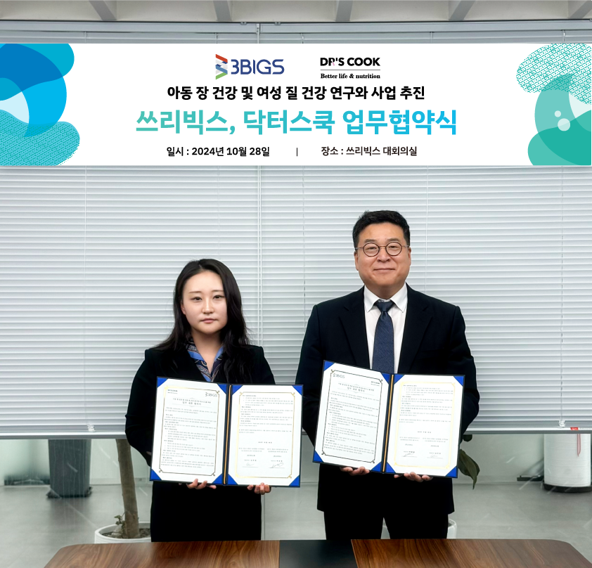 쓰리빅스는 닥터스쿡과 아동의 장 건강 및 여성의 Y존 헬스케어 연구, 사업화를 위한 업무 협약을 체결했다고 29일 밝혔다. 이번 협약의 주요 목표는 쓰리빅스가 자체 개발한 인체 마이크로바이옴 빅데이터 플랫폼과 닥터스쿡의 영.유아 및 임산부 기능성 식품 비즈니스를 결합한 서비스의 공동 연구다.