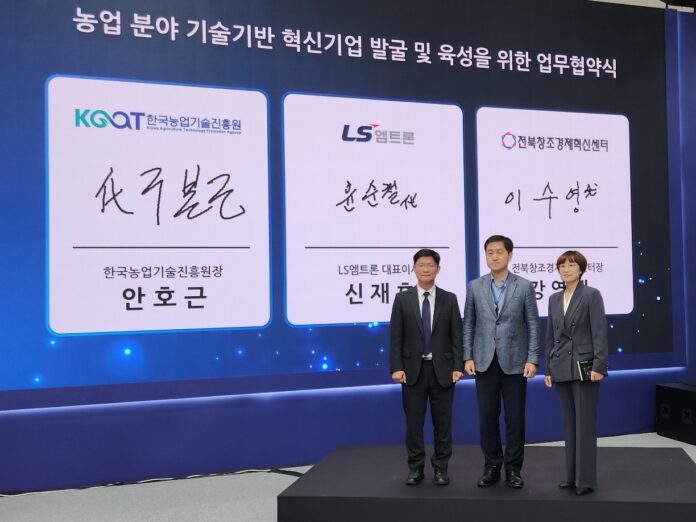 전북창조경제혁신센터(센터장 강영재, 이하 전북창조)는 30일 대구 EXCO에서 LS엠트론(대표이사 신재호), 한국농업기술진흥원(원장 안호근, 이하 농진원)과 ‘농업분야 기술기반 혁신기업 발굴 및 육성을 위한 업무협약’을 체결했다고 밝혔다.