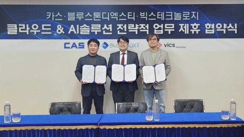㈜카스(대표 김태인), ㈜블루스톤디엑스티(대표 김경민), ㈜빅스테크놀로지(대표 김인석)는 카스 서울사무소에서 클라우드 및 AI 솔루션 분야에서의 전략적 협력 강화를 위한 업무협약(MOU)을 체결했다고 지난 10월 30일 밝혔다.