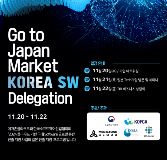 한국소프트웨어산업협회(회장 조준희, KOSA)와 메가존클라우드(대표 이주완)는 오는 21일과 22일 양일 간 일본 도쿄에서 ‘고 투 재팬마켓(Go to Japan Market)’ 프로그램을 개최한다.
