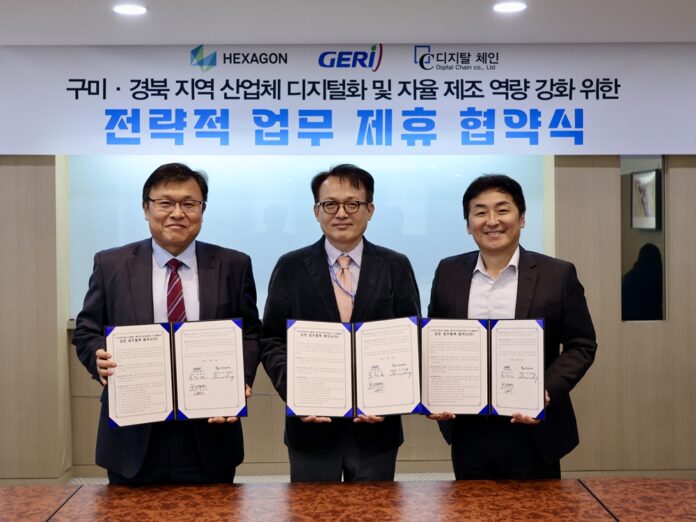 센서, 소프트웨어, 자율 기술을 결합한 디지털 리얼리티 솔루션 분야의 글로벌 리더 헥사곤 매뉴팩처링 인텔리전스(Hexagon Manufacturing Intelligence)는 구미전자정보기술원(GERI), 디지탈체인과 구미·경북 지역 산업체의 디지털화 및 자율제조 역량 강화를 위한 업무협약(MOU)을 구미전자정보기술원 본원에서 체결했다고 지난 12일 발표했다.
