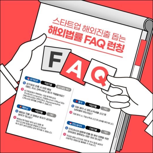 그 결과 신산업 스타트업들이 관심이 높은 미국, 중국, 일본, 베트남, 싱가포르, 인도네시아 등 6개국을 대상으로 공통적으로 궁금해하는 주요질문과 답변을 담은 총 365개의 해외법률 FAQ를 완성하였다.