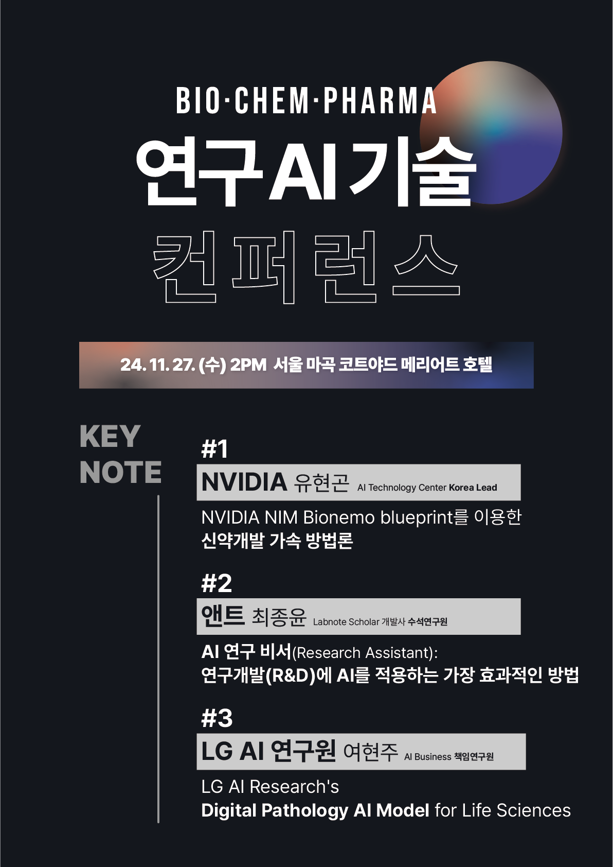 이번 행사에서 첫 번째 연사로 나서는 유현곤 NVIDIA AI Technology Center Korea 리드는 ‘NVIDIA NIM Bionemo blueprint를 이용한 신약개발 가속 방법론’을 주제로 발표하며, AI 기술을 활용한 신약개발 가속화를 위한 실질적인 방법론을 공유한다. 이어서 앤트의 최종윤 수석 연구원이 ‘AI 연구 비서(Research Assistant): 연구개발(R&D)에 AI를 적용하는 가장 빠르고 효과적인 방법’을 주제로 발표한다. 마지막으로 LG AI연구원의 여현주 책임연구원은 ‘LG AI Research’s Digital Pathology AI Model for Life Sciences’를 주제로 생명과학 분야의 AI 혁신 사례와 이를 실제 연구에 적용하는 방법을 설명할 예정이다.