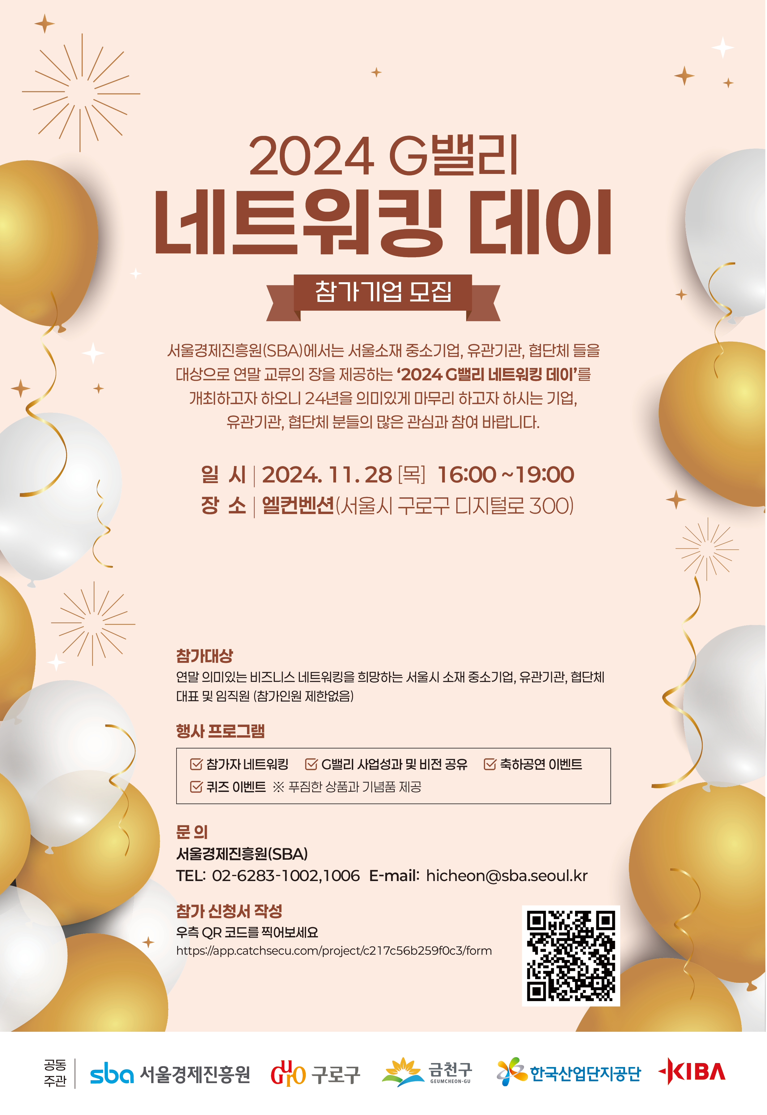 G밸리 네트워킹 데이는 2024년 11월 28일 구로구 구로동 엘컨벤션에서 서울경제진흥원과 구로구청, 금천구청, 한국산업단지공단, 한국산업단지경영자연합회(KIBA)와 공동으로 주관하며, G밸리 지역 기업 및 유관기관 관계자들이 대거 참여할 예정이다.