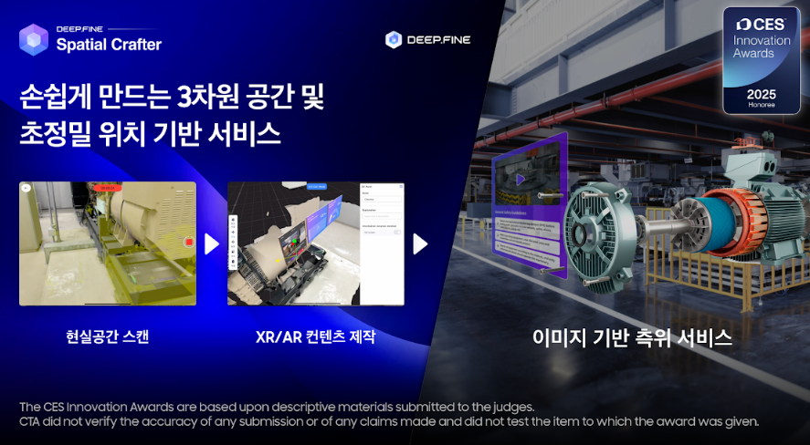 XR 공간 컴퓨팅 플랫폼 기업 딥파인은 내년 1월 미국 라스베이거스에서 열리는 ‘CES 2025’를 앞두고 발표된 ‘CES 혁신 어워즈(CES Innovation Awards)’에서 XR 공간정보 구축 솔루션 ‘DSC(DEEP.FINE Spatial Crafter)’로 혁신상(Innovation Awards Honoree)을 수상했다고 27일 밝혔다.